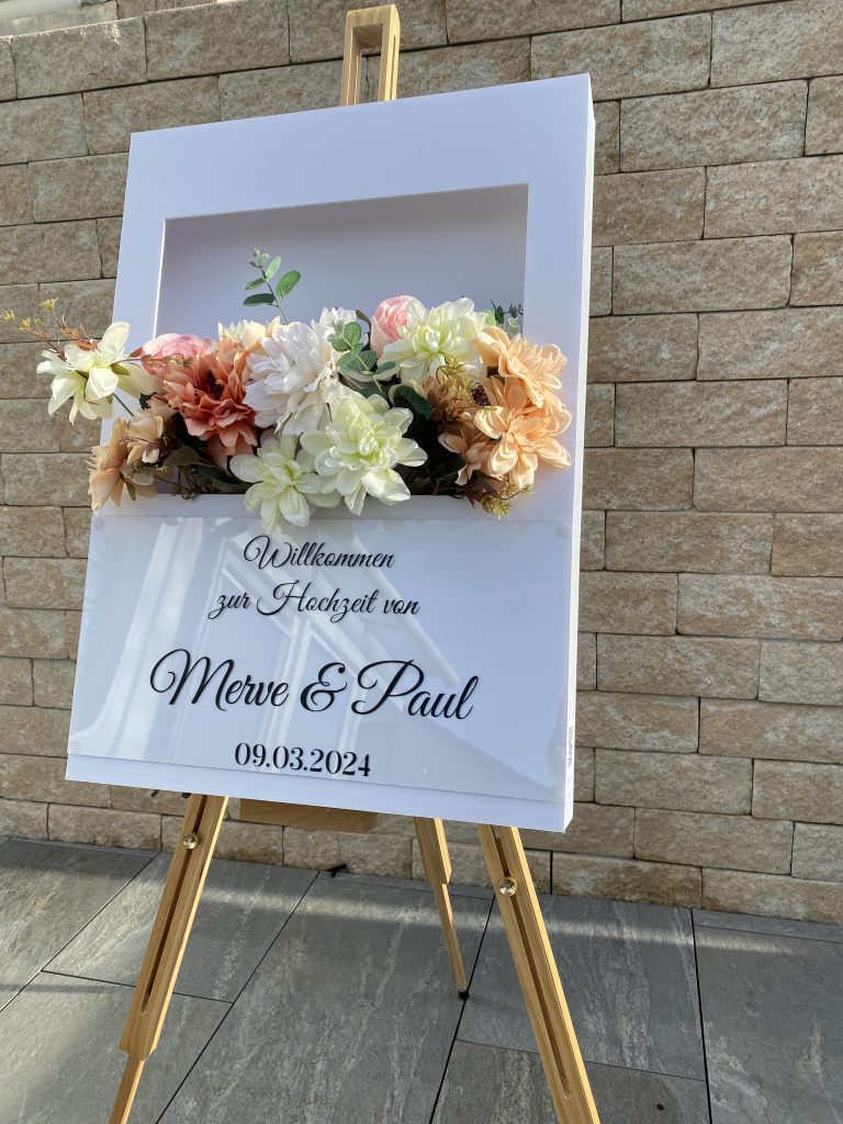 Dein großer Tag beginnt mit einem herzlichen Empfang. Ein Willkommensschild zur Hochzeit mit euren Namen und dem Hochzeitsdatum verleiht eurem Fest eine persönliche Note. Die integrierte Blumenbox harmoniert perfekt mit eurem Farbkonzept – ob Boho, modern oder romantisch. Tipp: Auch wunderschön als Fotohintergrund oder als Erinnerung nach der Hochzeit im Zuhause.