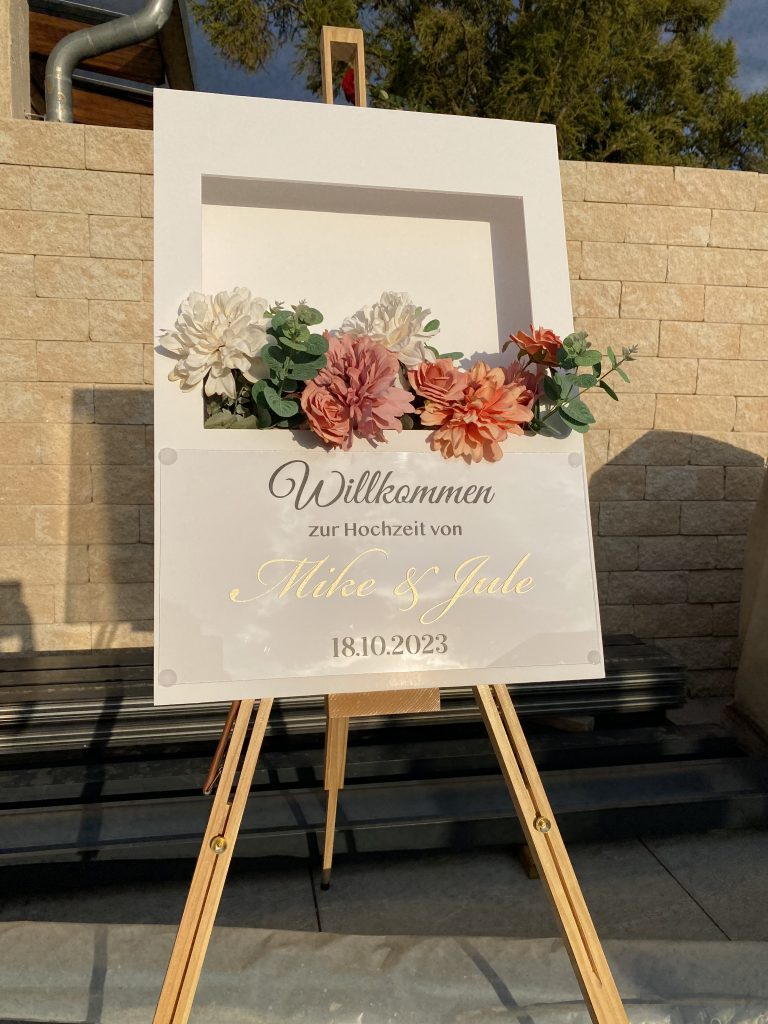Suchst du ein Willkommensschild zur Hochzeit, das auffällt? Unser Design vereint Handarbeit, Stil und Personalisierung.
