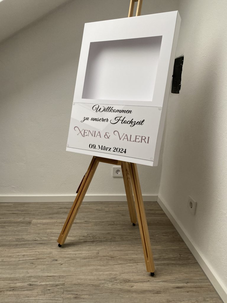 Dein großer Tag beginnt mit einem herzlichen Empfang. Ein Willkommensschild zur Hochzeit mit euren Namen und dem Hochzeitsdatum verleiht eurem Fest eine persönliche Note. Die integrierte Blumenbox harmoniert perfekt mit eurem Farbkonzept – ob Boho, modern oder romantisch. Tipp: Auch wunderschön als Fotohintergrund oder als Erinnerung nach der Hochzeit im Zuhause.